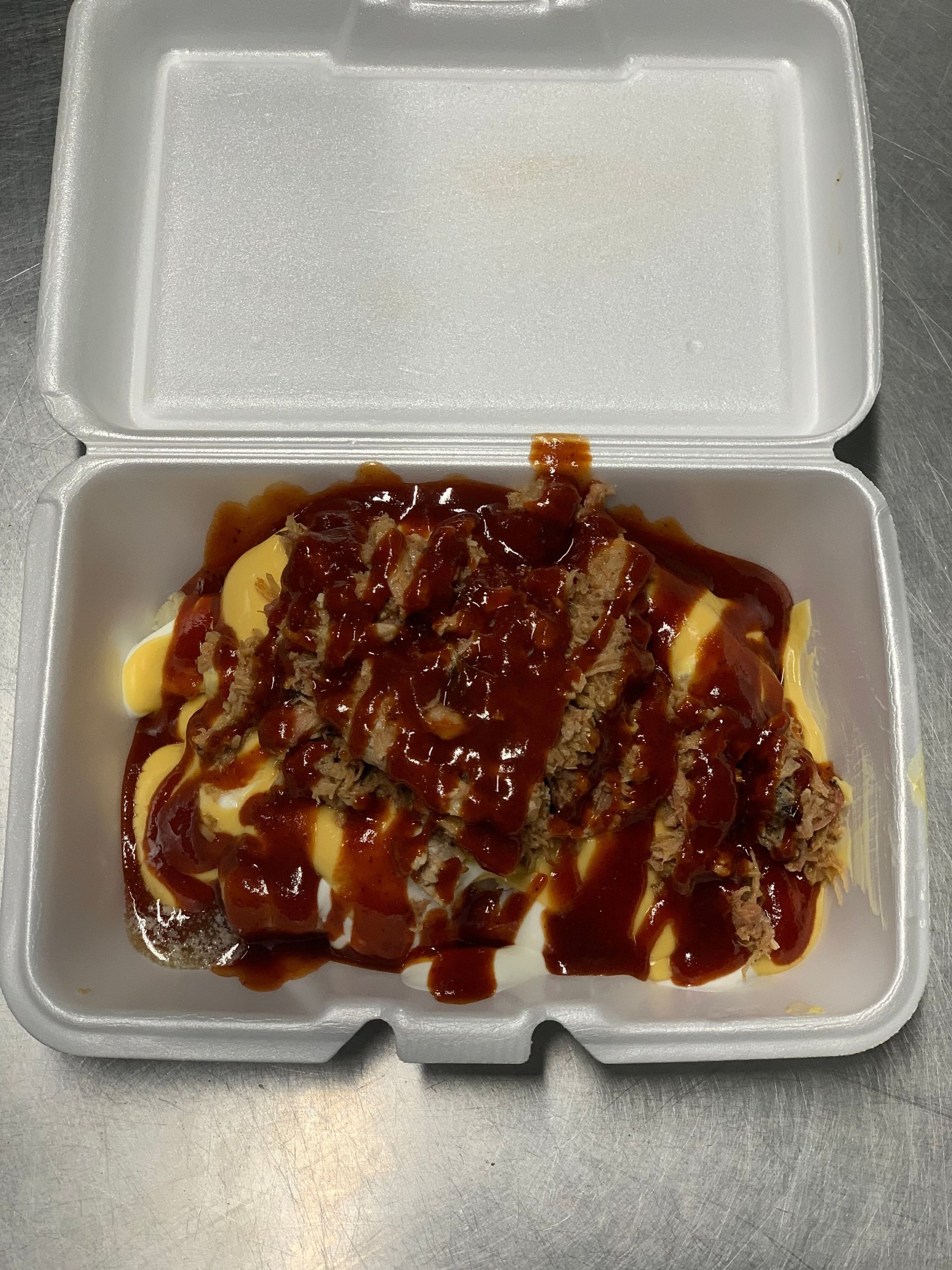 Loaded with Fresh Pulled BBQ, Brisket, or Chicken with Butter, Sour Cream , Shredded or Gourmet Nacho Cheese, & Sauce.